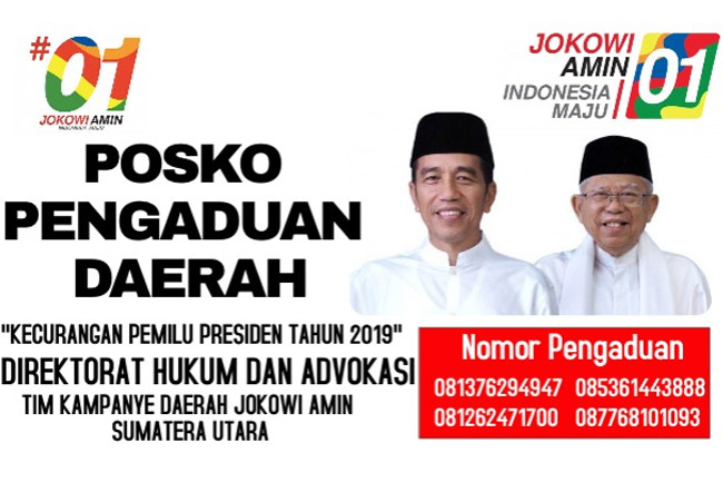 Medan, Gatra.com – Tim Kampanye Daerah (TKD) pasangan Calon Presiden (Capres) Nomor urut 01 membuka posko pengaduan di Kabupaten Kota di Sumatera Utara (Sumut). Posko tersebut dibuka untuk menerima setiap pengaduan atas kemungkinan kecurangan dan pelanggaran selama Pemilihan Presiden (Pilpres) 2019.