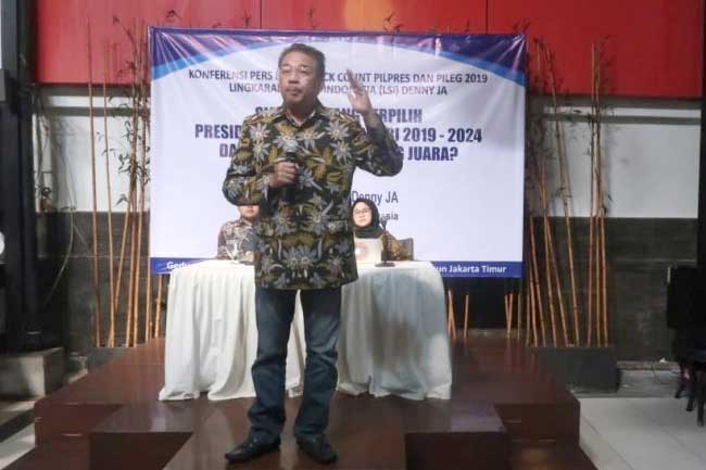 Jakarta, Gatra.com - Lingkaran Survei Indonesia (LSI) pimpinan Denny JA melakukan penghitungan cepat pilpres 2019. Hingga Rabu (17/4), pukul 18.04 WIB, pasangan capres-cawapres nomor urut 01, Joko Widodo-Ma'ruf Amin unggul atas capres-cawapres nomor urut 02, Prabowo Subianto dan Sandiaga Salahudin Uno, dengan presentase 55.41% untuk pasangan nomor urut 01 dan 44.59% untuk pasangan nomor urut 02.