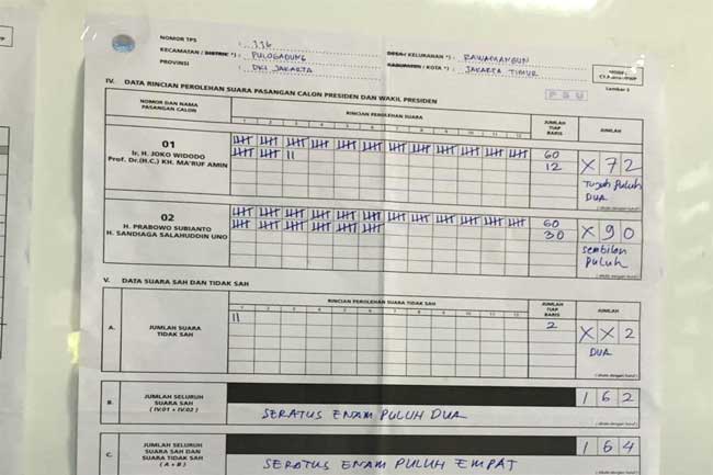 “Jumlah DPT di TPS 064 yaitu 293 pemilih. Yang datang memilih sebanyak 148 orang. Perolehan suara adalah Paslon 01 memperoleh 62 suara, dan Paslon 02 84 suara. Adapun suara sah yaitu 146, suara tidak sah yaitu 2,” ujar Ketua TPS 064, Ibn. Wijaya, Sabtu (27/4).