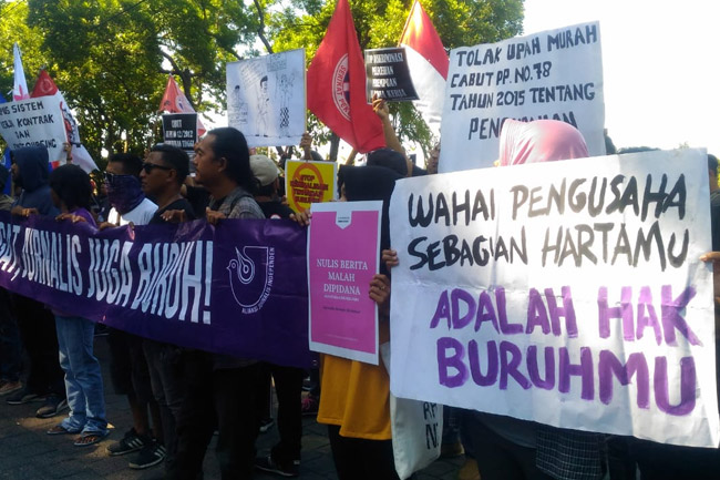 "Rendahnya upah yang diterima buruh berbanding terbalik dengan terus meningkatnya harga kebutuhan pokok rakyat yang semakin mencekik," jelasnya.