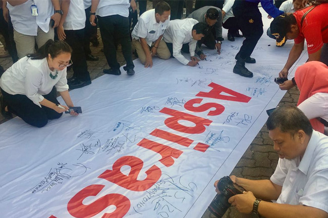 Mereka membentangkan spanduk berukuran 20 meter di halaman kantor dan menandatangani spanduk tersebut dengan spidol.