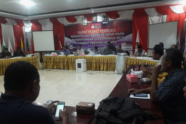 Pleno rapat terbuka KPU Maluku dipimpin Ketua Syamsul Rifan Kubangun dan didampingi empat komisioner Abdul Khalil Tianotak, Al Mudatsir Sangadji, Hanafi Renwarin, dan Engelbertus Renwarin.