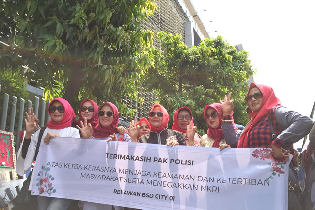 Jakarta, Gatra.com - Ucapan rasa terima kasih warga kepada TNI dan Polri khususnya di Gedung Bawaslu terus berdatangan. Di hari ini, Rabu (29/5) kelompok emak-emak dari BSD City datang dan berkumpul di depan Gedung Bawaslu. Mereka datang membawa puluhan kotak pakaian dalam laki-laki. Tak hanya itu mereka pun memberikan kue, handuk hingga pakaian dalam.