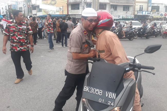Penyerahan takjil dilakukan oleh para perwira polisi tersebut dengan pelukan silaturahmi kepada warga. Salah satu momen yang sempat terabadikan wartawan saat Waka Polres Asahan berpelukan dengn seorang pengendara yang mendapat takjil berbuka puasa. "Terima kasih pak," ujar pengendera ini kepada Waka Polres Asahan tersebut.