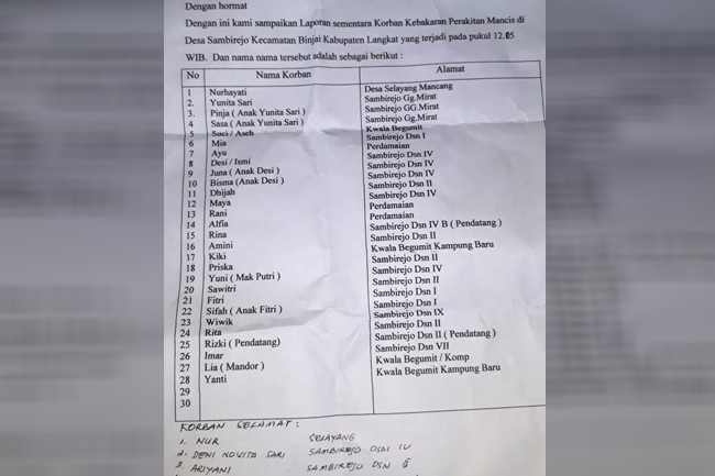 Korban kebakaran sebuah rumah yang dijadikan sebagai Pabrik Mancis atau pemantik api gas di Dusun IV Desa Sambi Rejo, Kecamatan Binjai mencapai 30 orang. Umumnya korban adalah para Ibu Rumah Tangga yang sedang bekerja.