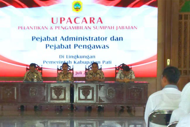 Pati, Gatra.com - Bertempat di pendopo Kabupaten Pati, Bupati Pati bersama para jajarannya pada Kamis (4/7) pagi mengadakan upacara pelantikan dan pengambilan sumpah jabatan bagi 38 ASN pejabat administrator dan pengawas di Kabupaten Pati.