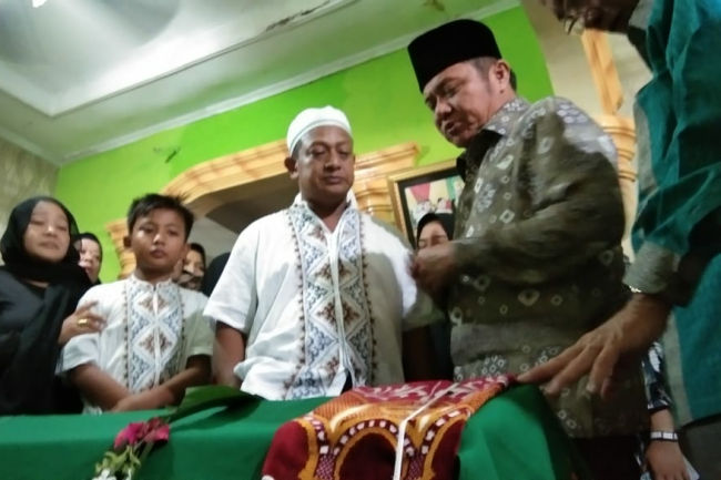 Palembang, Gatra.com - Gubernur Sumatera Selatan (Sumsel), Herman Deru dan Ketua Tim PKK Sumsel, Febrita Lustia Herman Deru melayat datang ke rumah duka, WJ (16) siswa SMA Taruna Indonesia yang dilaporkan menjadi korban kekerasan saat pelaksanaan MOS di sekolahnya.