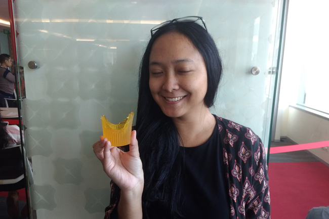 "Edible cup terbuat dari rumput laut dan konnyaku dimana bisa dimakan sehabis digunakan untuk minum. Bahan-bahannya semua sehat untuk dikonsumsi oleh setiap kalangan," ujarnya saat ditemui di DBS Bank Tower, Kuningan, Jakarta Selatan, Sabtu (27/7).