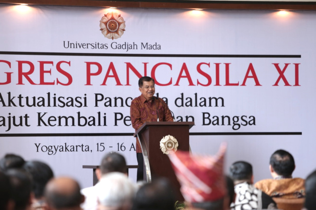 Wapres JK hadir di UGM membuka Kongres Pancasila XI bertemakan ‘Aktualisasi Pancasila dalam Merajut Kunci Persatuan Bangsa’.