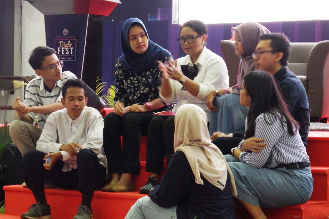 Menlu Retno mengambil inisiatif berdiri dari kursi duduknya, menyambangi mahasiswa yang lesehan untuk bergabung bersama-sama, area tangga panggung menjadi tempat paparan materi sekaligus tanya jawab antar Menlu Retno dengan para mahasiswa.