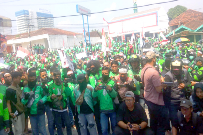 Bandar Lampung, Gatra.com - Ribuan mitra pengemudi Gojek yang tergabung dalam Gerakan Driver Online R2 dan R4 (Gedor) menggelar aksi demonstrasi didepan Kantor Operasional Gojek Lampung untuk menolak pemotongan bonus insentif sebesar 50 persen.