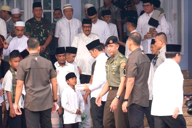 Pekanbaru, Gatra.com - Usai salat Istisqa di Masjid Amrullah Pangkalan Udara TNI AU Roesmin Nurjadin, Pekanbaru, Presiden Joko Widodo langsung bagi-bagi buku kepada anak sekitar masjid dan anak panti asuhan yayasan Lembaga Bakti Muslim Indonesia, Selasa (17/9).