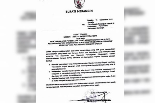 Merangin, Gatra.com – Surat Edaran (SE) Bupati Merangin Nomor 700/720/Inspektorat tentang penolakan mengatas namakan Bupati Merangin, keluarga bupati ataupun tim sukses terhadap kegiatan yang ada pada perangkat daerah. Namun SE itu dinilai sejumlah masyarakat hanya basa basi semata.