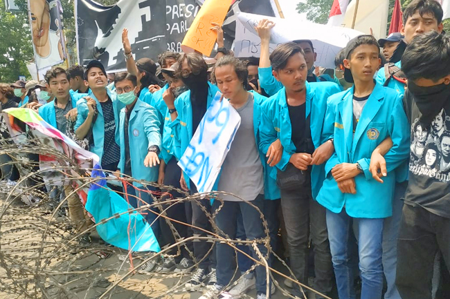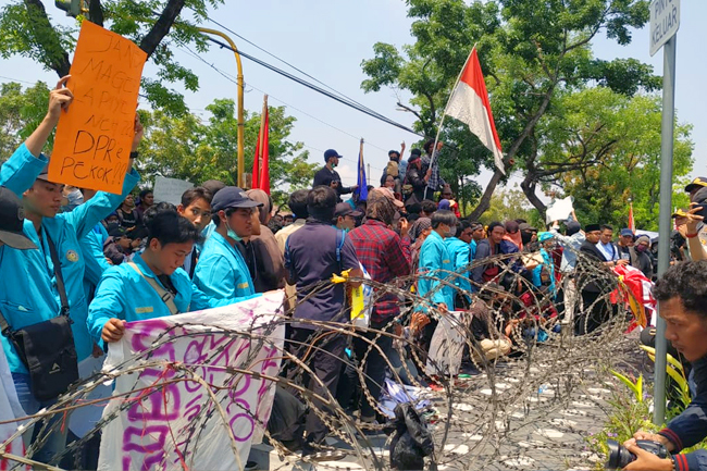 Di depan kantor DPRD Solo terpasang kawat berduri. Para mahasiswa yang memadati bagian depan DPRD menuntut untuk masuk. Mereka ingin bertemu dengan perwakilan DPRD Kota Solo untuk menyampaikan aspirasi.