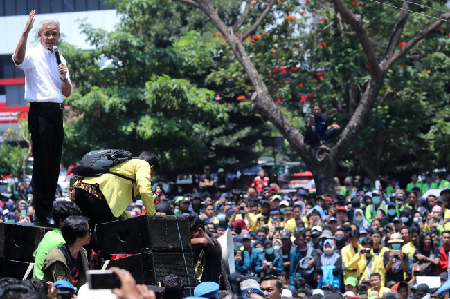 Gubernur Jawa Tengah (Jateng) Ganjar Pranowo yang menemui para pendemo, memberikan apresiasi karena jalannya aksi demonstrasi dari mahasiswa berbagai perguruan tinggi di Semarang berjalan dengan damai.