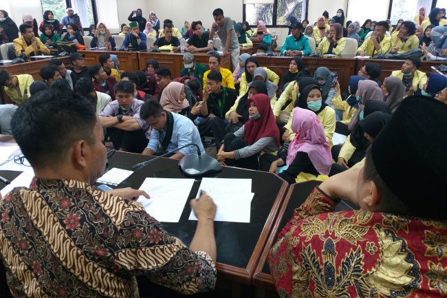 "Kami bukan pembuat undang-undang adik-adik, itu kerjaannya DPR. Kalau mau gampang, buat rekomendasi hari ini, turunkan Presiden Jokowi! Berani gak?" Tanya Hidayat dengan tegas, yang disambut teriakan mahasiswa.