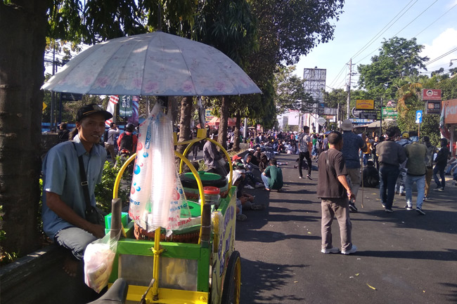 Yogyakarta, Gatra.com - Pedagang memanfaatkan momen aksi demonstrasi "Gejayan Memanggil 2", di Jalan Affandi, Yogyakarta, Senin (30/9), untuk menjajakan makanan dan minuman, terutama bagi peserta demo. Namun rezeki pedagang di aksi lanjutan dari "Gejayan Memanggil", Senin (23/9) lalu, itu tak sebanyak pada momen sebelumnya.