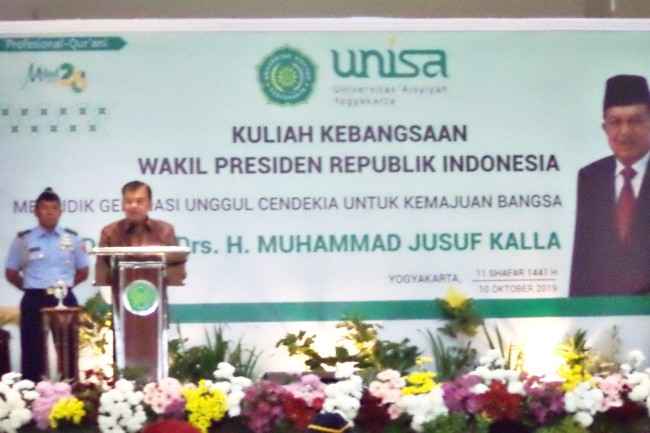 Hadir di Daerah Istimewa Yogyakarta, Wapres Jusuf Kalla mengisi kuliah kebangsaan di Unisa, Sleman, Kamis (10/10). Selama hampir empat puluh menit, JK mengisi materi bertema ‘Mendidik Generasi Unggul Cendikia Untuk Kemajuan Bangsa’.