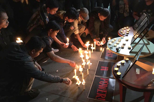 Para peserta duduk melingkar dengan menyalakan lilin sebagai bentuk duka cita dan masih adanya harapan akan demonrasi yang lebih baik.