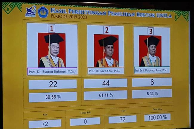 Senat yang memberikan suara 48 senat atau sebesar 65 persen, hanya satu senat yang berhalangan hadir pemilihan, yakni Prof. Dr. Satria Bangsawan, S.E., M.Si, Sementara itu perwakilan dari Kementerian Ristek Dikti yang memiliki hak suara 35 persen.