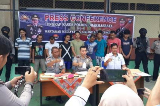 Adapun dua tersangka, yakni Delfira Erianda (35) dan Sugiono (43) yang diringkus merupakan bandar narkoba memiliki jaringan edar di wilayah Dharmasraya. Sementara tujuh tersangka lainnya, Arbima Sakti (19), Aldo (18), Azzuarni Tanjung (32), Pandu Aguski (26), Gunawan Tua (25), Takdir (21), dan Edi Kurniawan (31), orang luar Dharmasraya.