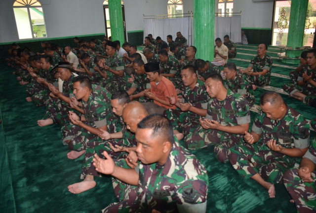 Pelaksanaan salat dipimpin oleh Ustad Letda Inf Syamsul Rijal.