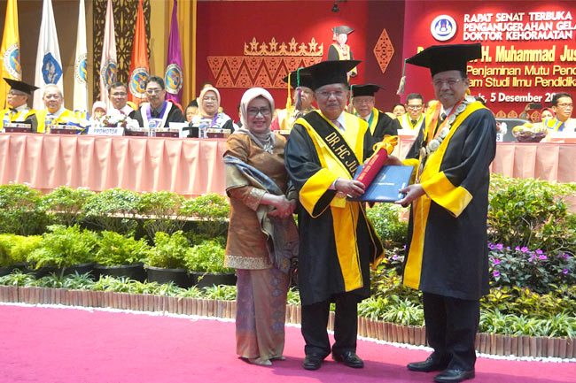 Padang, Gatra.com - Mantan Wakil Presiden Republik Indonesia, Muhammad Jusuf Kalla dianugerahi gelar Doktor Honoris Causa (DR HC) bidang penjaminan mutu pendidikan dari Universitas Negeri Padang, dalam rapat Senat Terbuka, Kamis (5/12).