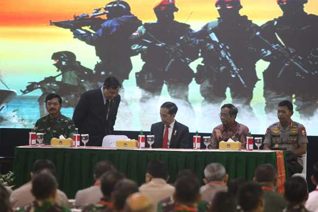 Dalam sambutan di Rapim tersebut, Jokowi didampingi Menteri Pertahanan Prabowo Subianto, Panglima TNI Marsekal Hadi Tjahjanto, Kapolri Idham Azis dan Menteri Koordinator Bidang Politik, Hukum dan Kemanan, Mahfud MD.