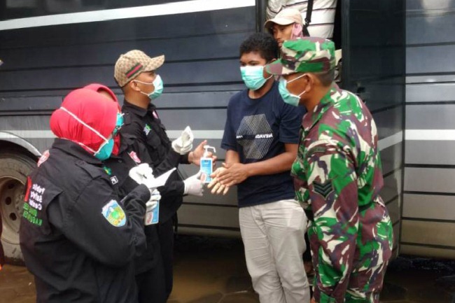 Jepara, Gatra.com - Mengantisipasi sebaran virus korona pasca diliburkannya pekerja di perusahaan Jakarta. Pemkab Jepara melalui Satgas Covid-19 mendirikan dua posko untuk mengecek kesehatan para pekerja itu, saat masuk di Kabupaten Jepara, Jawa Tengah.