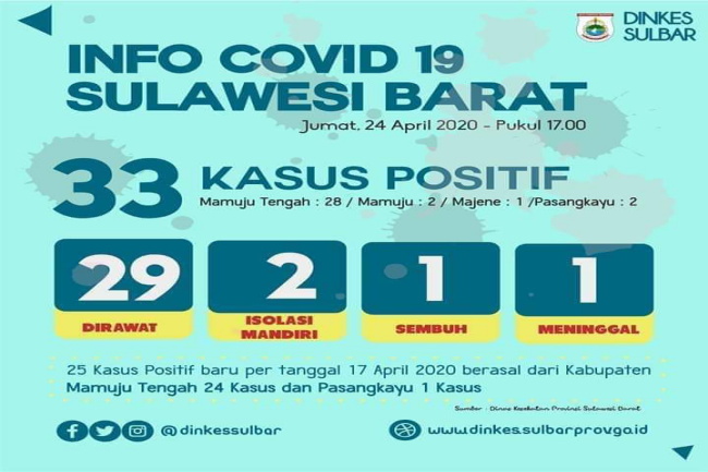 "Iya ada tambahan Sulbar, sebanyak 25 orang, dan pasien Positif covid-19 disulbar menjadi 33 kasus dari sebelumnya hanya berjumlah 8 kasus. 24 pasien Positif covid-19 masih kluster dari desa Pontanakayang, Kecamatan Budong-budong, kabupaten Mamuju tengah ( Mateng ) dan satu tambahan pasien dari Kabupaten Pasangkayu." kata dr. Ihwan di WA group covid-19 Sulbar, Jumat (24/4).