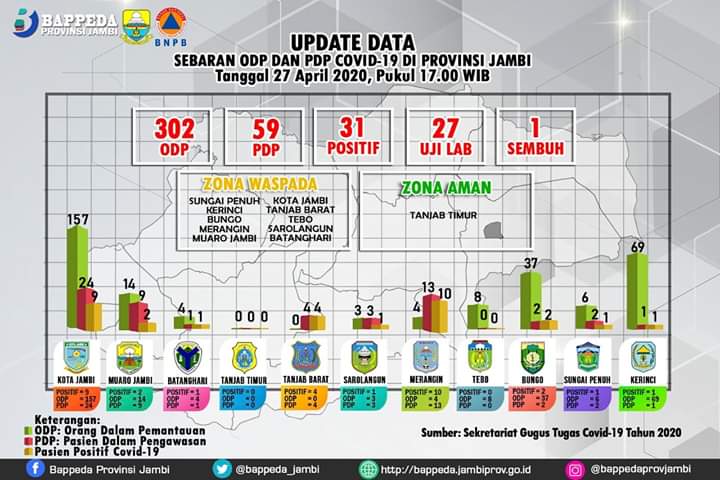 Dengan sebaran, 302 ODP 59 PDP 31 Positif 27 Uji Lab dan satu pasien dinyatakan sembuh corona di Provinsi Jambi. Pasien sembuh diketahui Sekda Tebo, Teguh Arhadi.