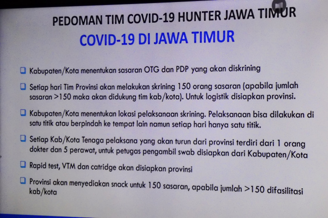 Surabaya, Gatra.com - Pemerintah Jawa Timur membentuk Tim Covid-19 Hunter. Berbeda dengan Covid-19 Hunter bentukan Polda Jawa Timur, tim itu akan melakukan skrining kesehatan kepada para Pasien Dalam Pengawasan (PDP) dan Orang Tanpa Gejala (OTG)