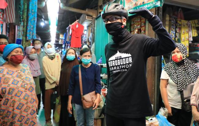 Ganjar yang datang dengan gowes sepeda balap melihat kondisi pasar tetap kumuh dengan pedagang dan pembeli berjubel tanpa sekat. Tak ada penataan jarak antara kios pedagang.