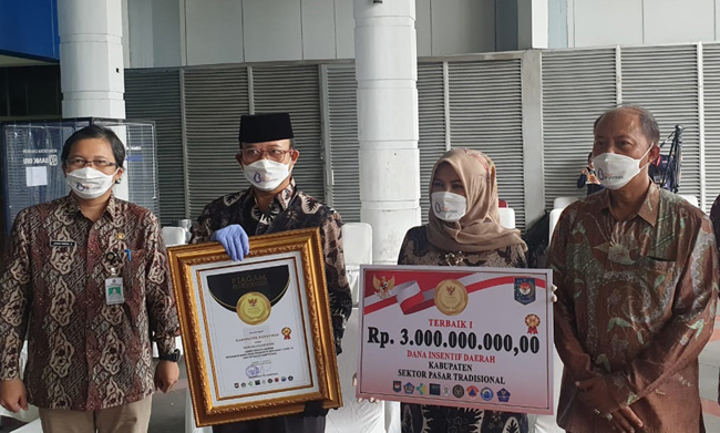 Banyumas, Gatra.com - Pemerintah Kabupaten (Pemkab) Banyumas, Jawa Tengah, meraih Juara Pertama penghargaan Lomba Inovasi Daerah Penyiapan Tatanan Normal Baru Produktif dan Aman Covid-19 yang digelar oleh Kementerian Dalam Negeri (Kemendagri). Penghargaan itu diperoleh pada sektor Pasar Tradisional.