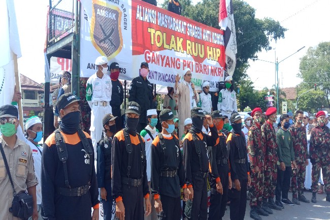 Sragen, Gatra.com - Forum Umat Islam Sragen (FUIS) bersama Aliansi Masyarakat Sragen Anti Komunis berunjuk rasa menolak Rancangan Undang - Undang Haluan Ideologi Pancasila (RUU HIP). Massa menilai RUU tersebut mendistorsi makna pancasila yang tertuang dalam batang tubuh UUD 1945.