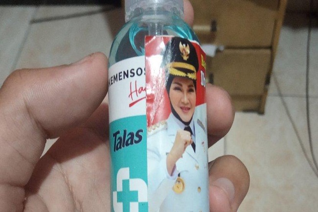 Akhir April 2020 lalu, beredar foto botol hand sanitizer gambar foto Bupati Klaten Sri Mulyani. Sayang, tim penempel foto tidak cermat. Ada sejumlah botol yang masih terlihat tulisan awalnya, yakni Kemensos.