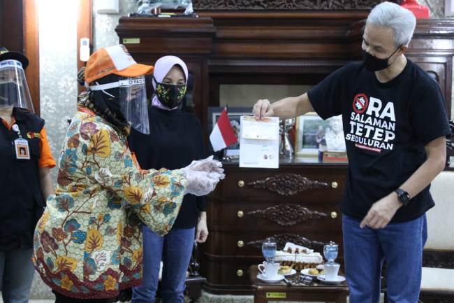 Petugas Pemutakhiran Data Pemilih (PPDP) dari KPU Semarang datang dengan mengenakan alat pelindung diri lengkap, seperti masker, face shield, dan sarung tangan. “Masyarkat peduli pada daerahnya masing-masing dengan mensukseskan coklit, karena akan menentukan nasib daerah mereka,” kata Ganjar.