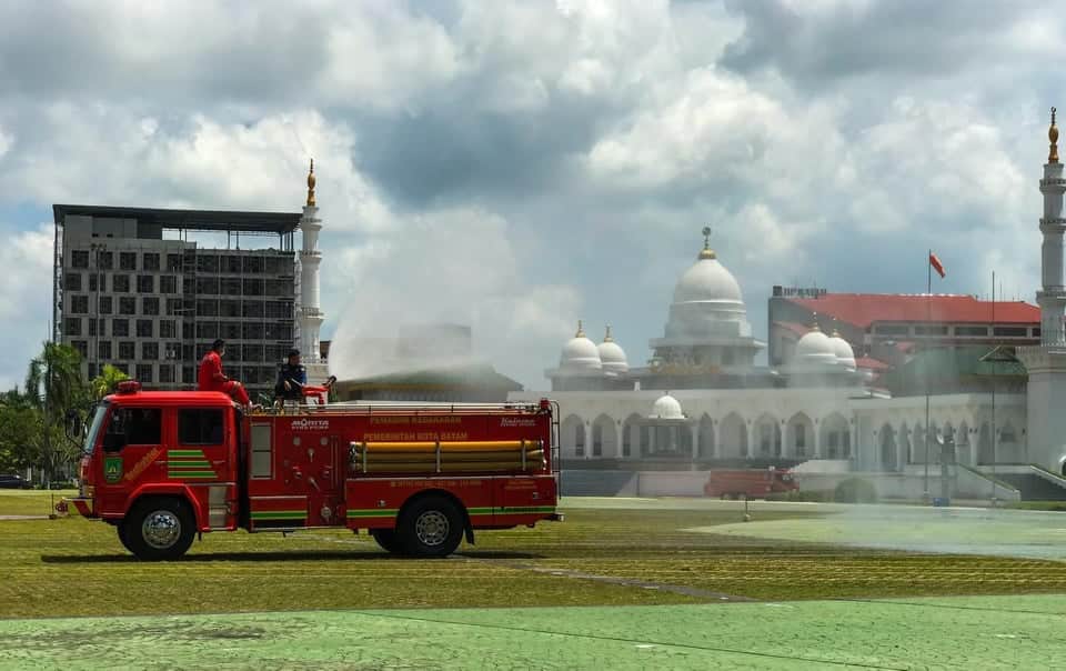 Pantauan di lapangan, sejumlah petugas dari Dinas Pemadam Kebakaran (Damkar) Kota Batam menerjunkan dua unit mobil damkar. Tim terlihat menyemprotkan cairan disinfektan ke seluruh sudut Alum-alun Kota Batam tersebut.