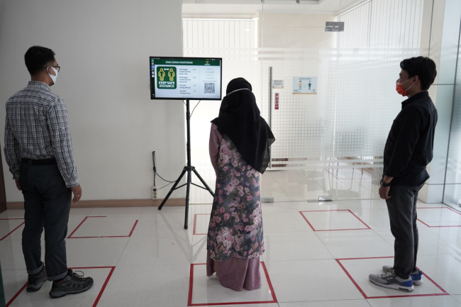 Misalnya terdapat orang yang melanggar ketentuan physical distancing, alarm lalu berbunyi dan mengimbau agar pengunjung bisa menjaga jarak aman sesuai dengan ketetapan protokol yang berlaku.