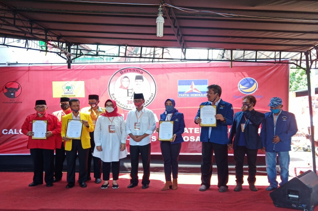 Sukoharjo, Gatra.com - Empat partai politik (Parpol) pengusung bakal pasangan calon (Bapaslon) Bupati dan Wakil Bupati Sukoharjo Etik Suryani-Agus Santosa atau EA resmi melakukan deklarasi. Deklarasi ini dilakukan di kediaman Etik Suryani di Jalan Merpati BB-1, Perumahan Solo Baru, Kecamatan Grogol, Sukoharjo, Jumat (4/9).
