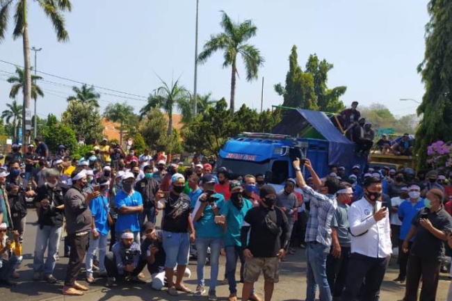 Jepara, Gatra.com - Ratusan pengunjuk rasa tumpah ruah di lingkungan Kantor Bupati Jepara, Jawa Tengah Senin (14/9). Demonstran yang berasal dari kalangan pekerja seni menuntut pemerintah, agar panggung hiburan di Bumi Kartini diperbolehkan kembali.