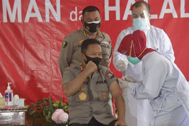 Tanjungpinang, Gatra.com - Kapolda Kepulauan Riau Irjen Pol Aris Budiman bersama Gubernur Provinsi Kepri H. Isdianto, dan sejumlah pimpinan Forum Komunikaai Pimpinan Daerah (Forkompinda) Kepri menjalani vaksinasi Covid 19, Kamis (14/1) di Tanjungpinang, Kepri.