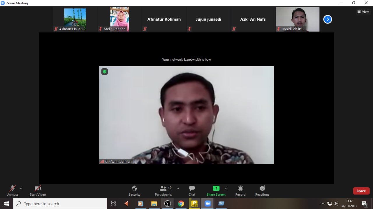 "Badan Pengawas Obat dan Makanan (BPOM) sudah menyetui penggunaan vaksin tersebut dan dinyatakan aman karena sudah melalui uji klinis. MUI juga sudah mengeluarkan fatwa bahwa vaksin covd-19 halal. Namun untuk efektifitasnya belum bisa diketahui karena proses vaksinasinya belum selesai" ujarnya saat pemaparan materi.