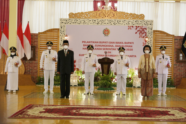 Sultan melantik tiga pasangan pemenang pilkada di tiga kabupaten di DIY, di kompleks kantor Gubernur DIY, Jumat (26/2), dan disiarkan daring. Ketiganya adalah Kustini Sri Purnomo – Danang Maharsa yang memimpin Sleman, Abdul Halim Muslih - Joko Purnomo untuk Bantul, dan Sunaryanta - Heri Susanta dari Gunungkidul.