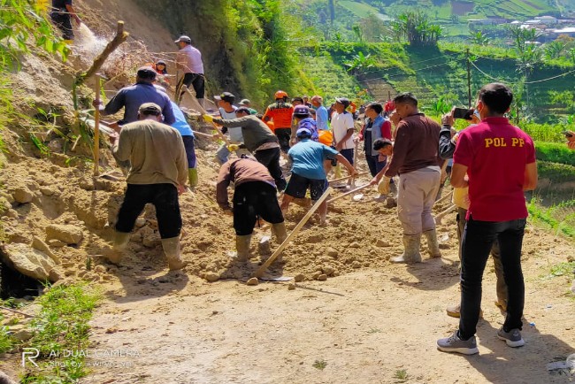 "Baru Jumat pagi warga dan para sukarelawan sekitar 50 orang membersihkan longsoran. Dengan cara manual, sepertinya dua hari saja belum bisa selesai. Kalau dengan ekscavator untuk mengeruk, dikhawatirkan getarannya merontokkan lagi yang di atas. Kita belum mendatangkan alat berat itu. Lagipula ekscavator juga sulit menjangkau lokasi," lanjutnya.