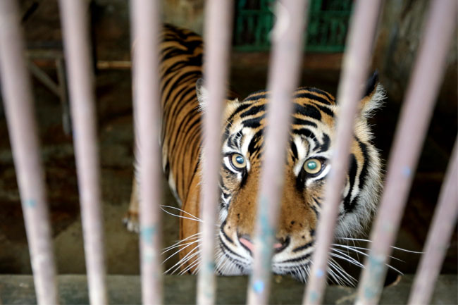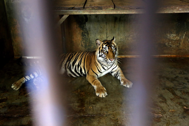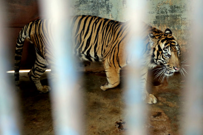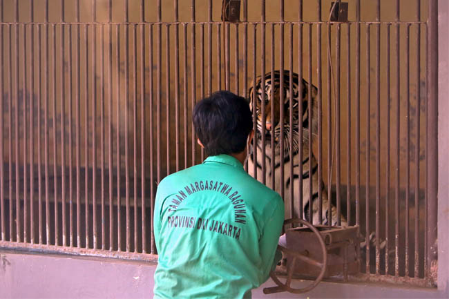 Di dalam area kompleks bangunan suasanannya lengang, hanya ada sekitar lima orang yang berada di depan kandang. Gatra sempat mengintip dari celah kecil di gerbang, karena memang masuk area itu tidak boleh sembarangan dan hanya khusus yang berkempentingan. Suasana lengang, kamar-kamar kandang itu sendiri berada di sebelah kanan. Tampak dari kejauhan dua orang keeper sedang sibuk di depan salah satu kamar, yang satu berdiri sambil memegang alat tes, dan yang satu lagi sedang merayu dengan menyodorkan ayam hidup di pintu kandang yang tertutup. Mereka pun bercakap-cakap dengan penghuni di dalamnya, seakan seperti teman atau mirip ngemong anak kecil. Sesekali penghuni bercorak loreng itu berdiri, menampakkan diri di jeruji, berdialog dengan yang teman dekatnya. Tino juga terlihat santai ketika alat tes itu masuk ke hidungnya, memang agak sedikit kaget dan mengaum. Tidak heran, karena manusia saja juga tidak nyaman ketika harus menjalani tes swab PCR.