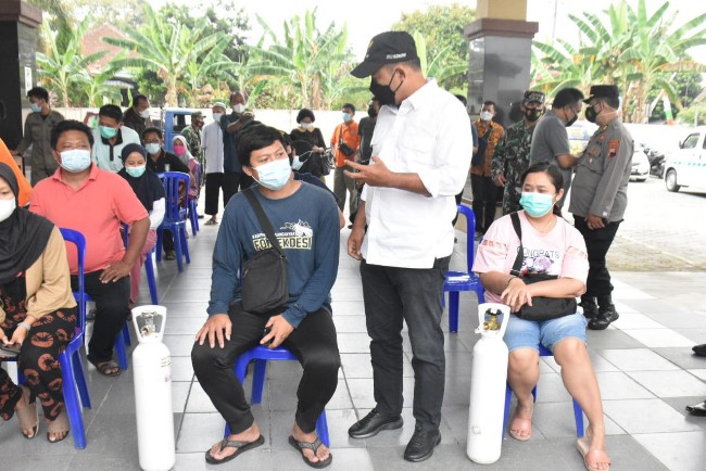 Karanganyar, Gatra.com - Pemkab Karanganyar, Jateng membagikan oksigen isi ulang gratis ke warga yang membutuhkan di wilayah Kecamatan Jumapolo dan sekitarnya, Minggu (8/8). Kegiatan sosial ini merupakan putaran ke empat setelah Karanganyar Kota, Colomadu dan Kerjo. Dalam kegiatan tersebut, Bupati Karanganyar Juliyatmono meminta warga terpapar Covid-19 yang sedang isolasi mandiri di rumah supaya pindah ke tempat isolasi terpusat.