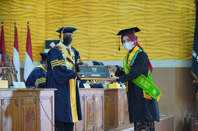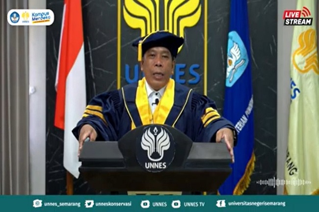 Semarang, Gatra.com - Universitas Negeri Semarang (UNNES) menggelar wisuda ke-107 program Doktor, Megister, Sarjana, dan Diploma. Acara digelar secara hybrid luring terbatas dengan protokol kesehatan yang ketat dan dan daring, Rabu (1/9).