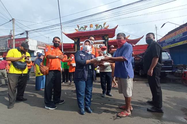 “100 dos nasi bantuan BMT Amanah Indonesia, BPBD kab Banyumas membagikan 850 masker dan menyerahkan pada UPT Pasar Wage 20 botol sabun cair dan 50 Sabun batangan,” kata Titik.