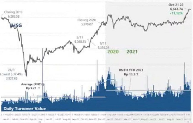 Verdi menambahkan, rata-rata nilai transaksi harian (RNTH) pada tahun ini mencapai Rp13,5 triliun. Nilai tersebut meningkat signifikan dibandingkan RNTH tahun 2020 yang berada di kisaran Rp9,21 triliun per hari, serta tahun 2019 yang sekitar Rp9,1 triliun per hari.